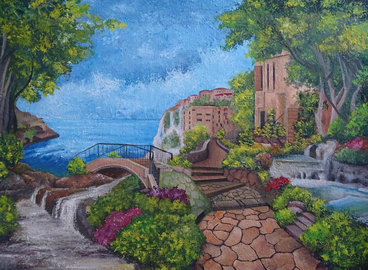 A vibrant Mediterranean coastal escape, where stone paths wind past colorful gardens, flowing waterfalls, and cliffside views of the shimmering sea. A painting full of life, peace, and the joy of nature’s beauty.