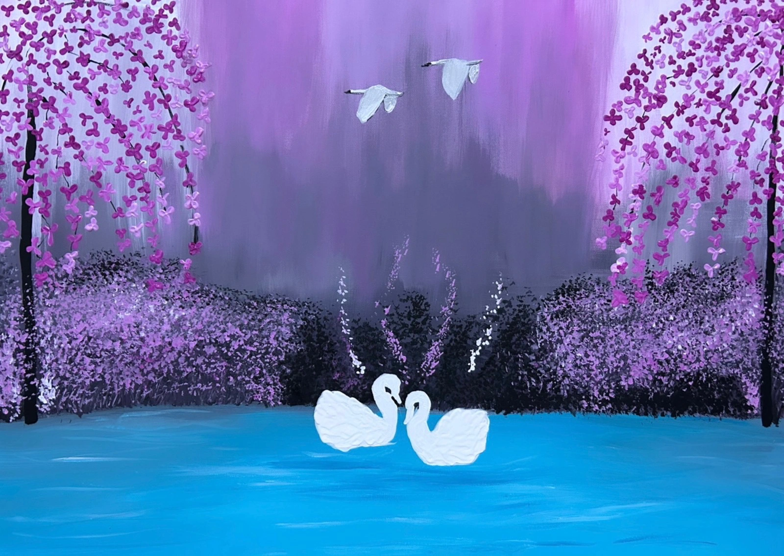 In a dreamy purple-pink forest, two swans float gently across a peaceful lake, their reflections forming a perfect heart. A soft, romantic scene that whispers of love, purity, and calm.